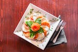 Breaded veal topped with basil, chopped tomatoes and red onions marinated in balsamic vinaigrette dressing.