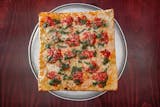 Thick crust square pizza with tomato sauce, mozzarella and basil.